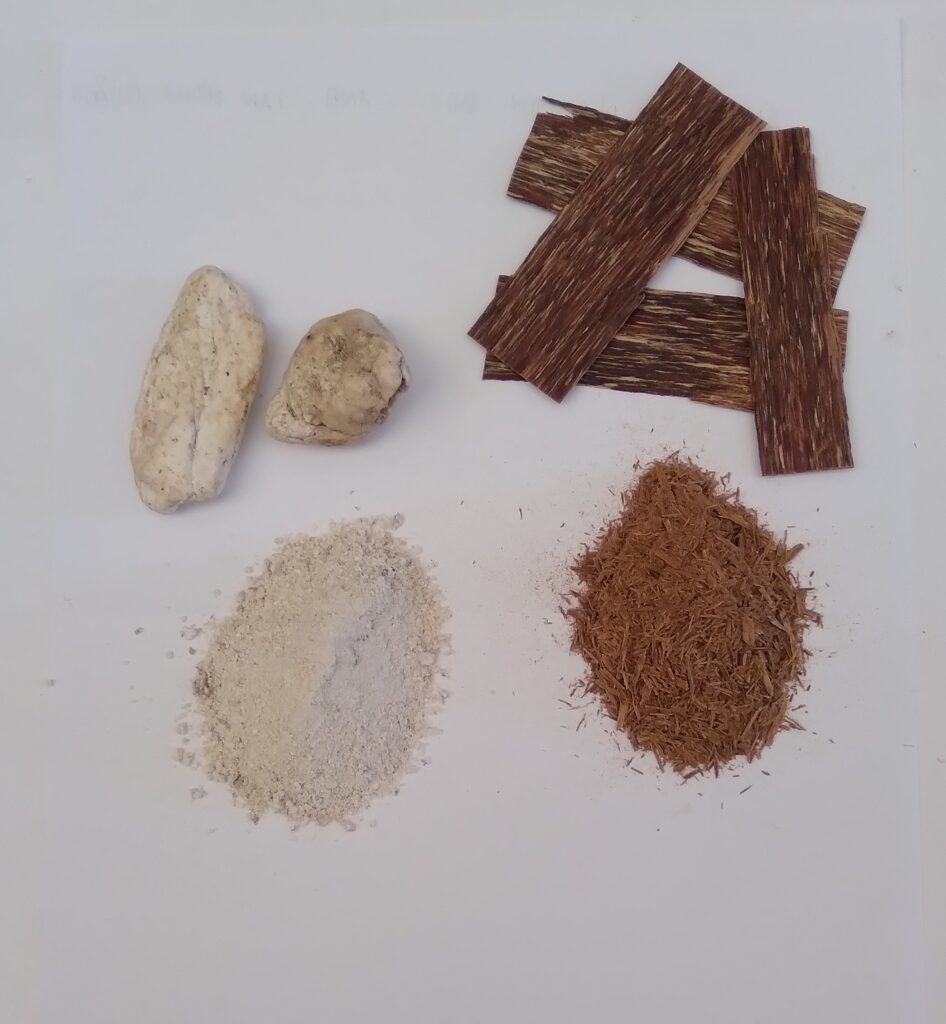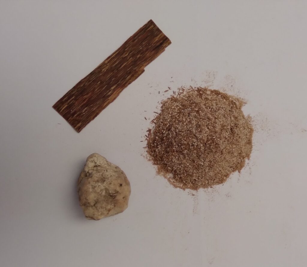 Shown top left are 2 x 10 gram pieces of New Zealand White Ambergris. Bottom left is 7 grams of powdered Ambergris. Top right is 7 grams of high resin sustainably cultivated Agarwood. Bottom right is 7 grams of hand ground Agarwood.